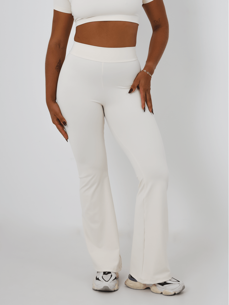 Legging de cintura alta e cós largo no modelo flare, que é mais justo na coxa e vai abrindo na parte de baixo, estilo boca de sino. Ela é em um tecido que garante uma ótima firmeza, conforto e se adapta perfeitamente ao corpo. Possui costura empina bumbum.