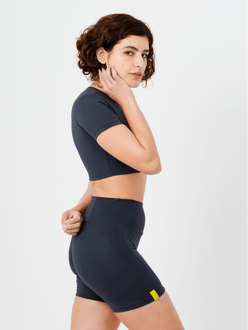 O tecido Action é uma poliamida com elastano macia e adaptável, que se ajusta perfeitamente ao corpo. Encorpado e com toque aveludado, proporciona sensação de frescor durante o uso.