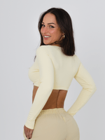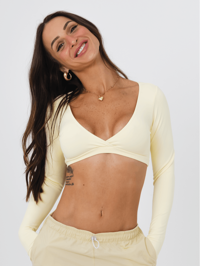 Cropped de manga longa com duas opções de decote para você usar! O decote em V deixa à mostra na medida certa, pois possui elástico na parte do busto, garantindo sustentação. Também há a opção de usar o decote arredondado, que oferece uma opção mais fechada. Este cropped é ótimo para os dias mais frios ou para compor looks lindíssimos no dia a dia. Silk da logo na lateral do decote. Não possui entrada para bojo.