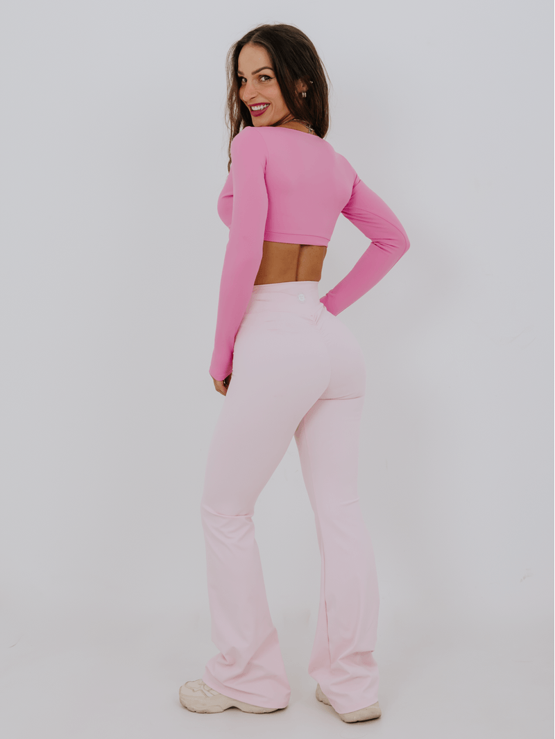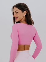 Cropped de manga longa com duas opções de decote para você usar! O decote em V deixa à mostra na medida certa, pois possui elástico na parte do busto, garantindo sustentação. Também há a opção de usar o decote arredondado, que oferece uma opção mais fechada. Este cropped é ótimo para os dias mais frios ou para compor looks lindíssimos no dia a dia. Silk da logo na lateral do decote. Não possui entrada para bojo.