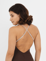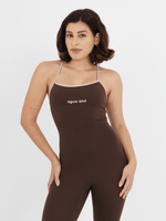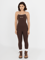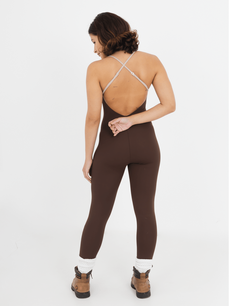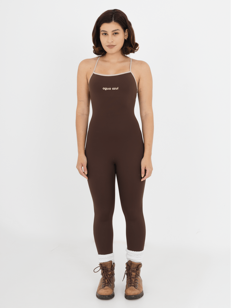 Macacão longo, sem costura frontal, com decote reto na frente e forro para maior conforto. Nas costas, ele é decotado e as alças possuem reguladores para melhor ajuste ao corpo. Não possui entrada para bojo.