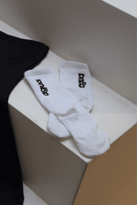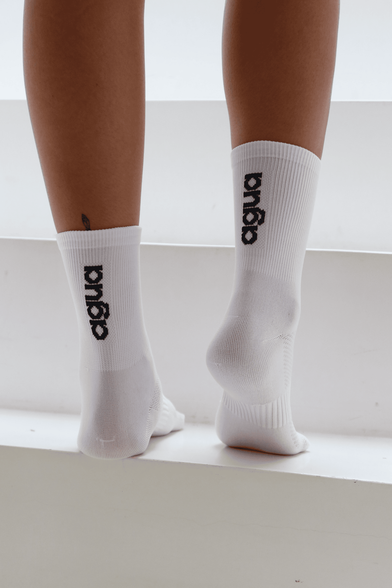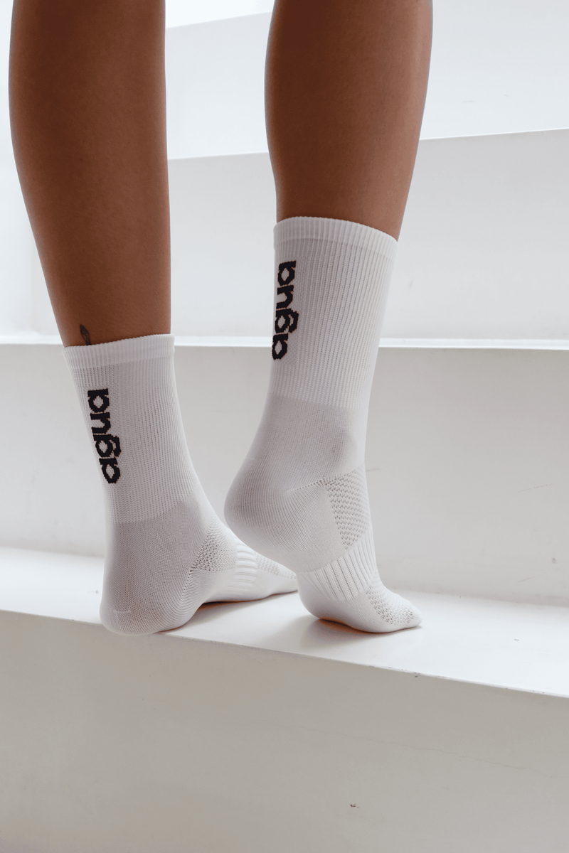 Par de meias de comprimento médio com logo na parte de trás. Calça do nº 36 ao 40. Cor: Branca Composição: 80% Algodão + 12% Elastano + 6% Poliamida + 2% Elastodieno