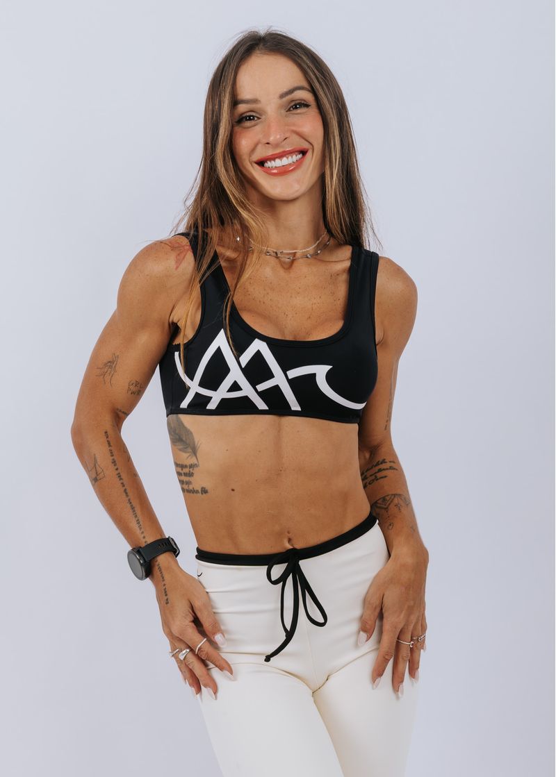 Com nossa logo AA em destaque, o Top Brand é um modelo super autêntico! Com um decote arredondado e alças mais grossinhas, ele garante uma sustentação excelente. Nas costas, tem um recorte mais cavado. Possui entrada para bojo.